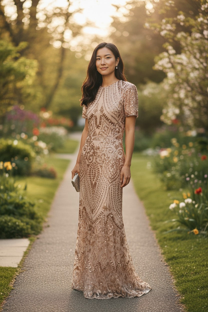 Crafted in a warm champagne tone, the Laverne features intricate sequined motifs that create a sculpted, art-deco–inspired pattern from neckline to hem. The fitted silhouette beautifully highlights your natural curves before flowing into a softly flared skirt that moves with effortless grace.