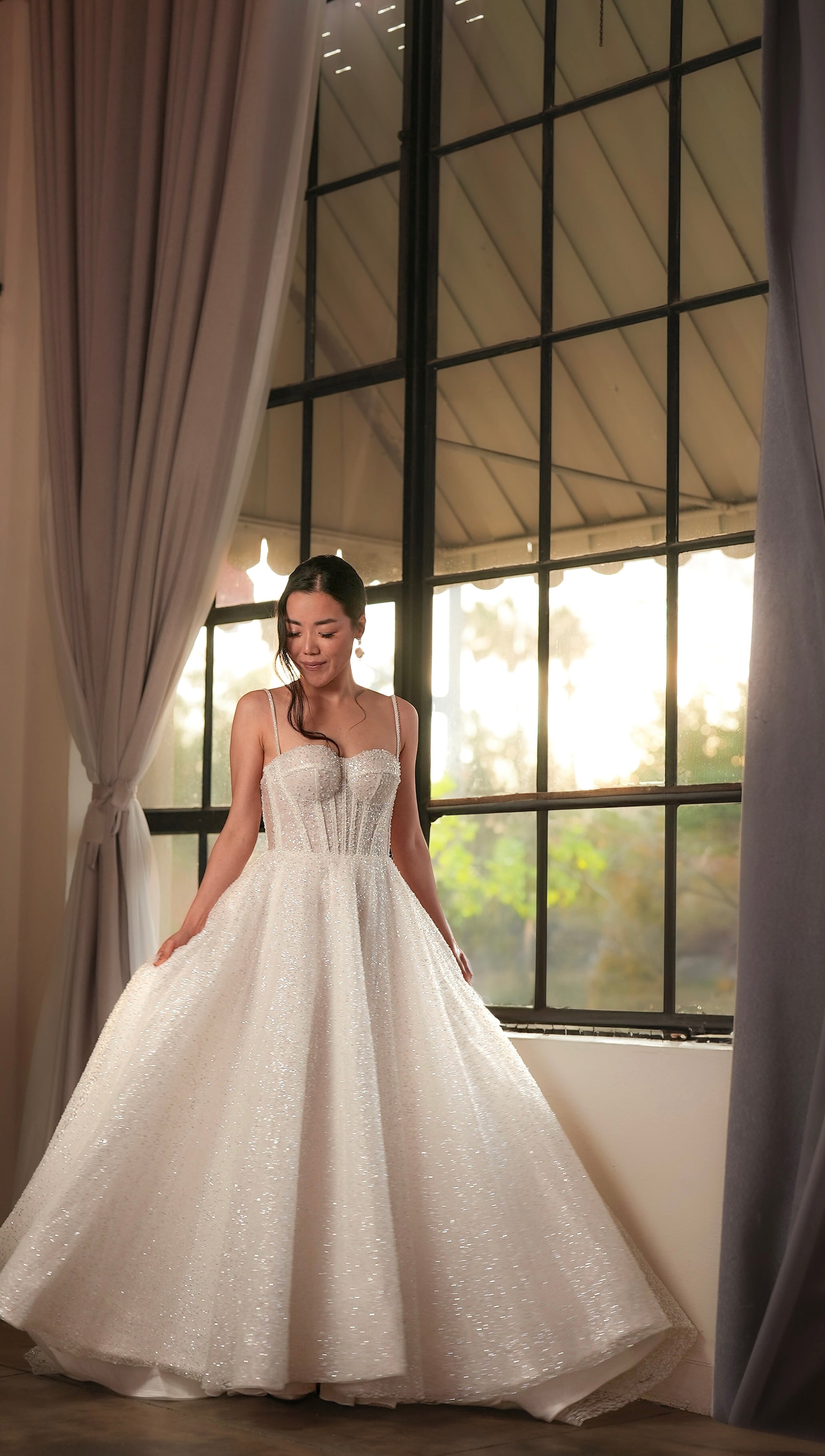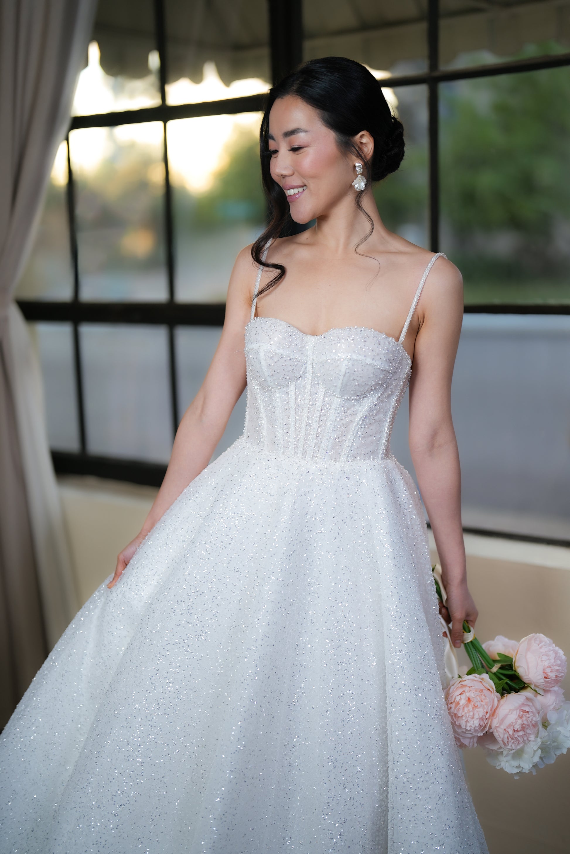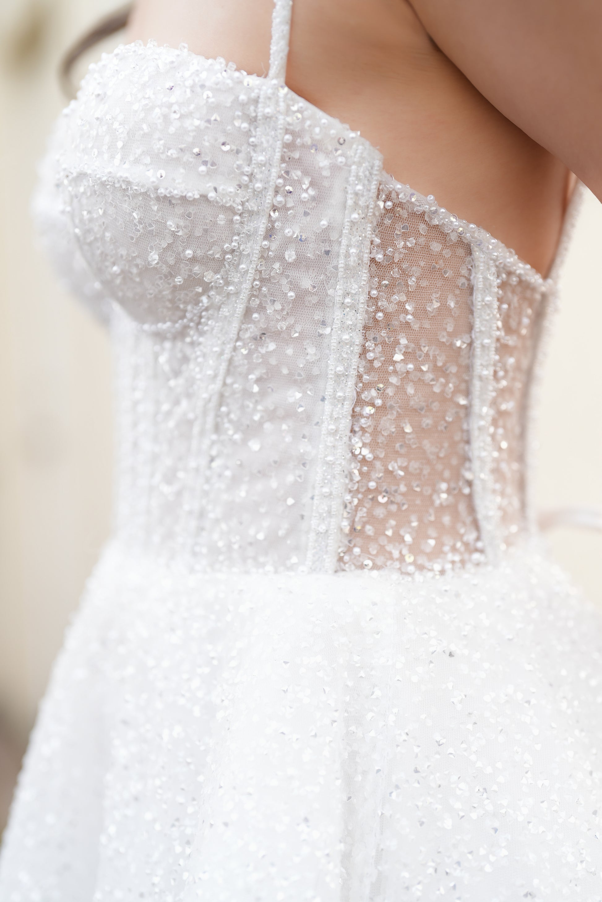 This sparkle A-line dress with a bustier neckline combines timeless elegance with modern flair, ideal for both glamorous evening weddings and chic garden ceremonies. Perfect for the bride who wants to make a luminous statement for an unforgettable day.