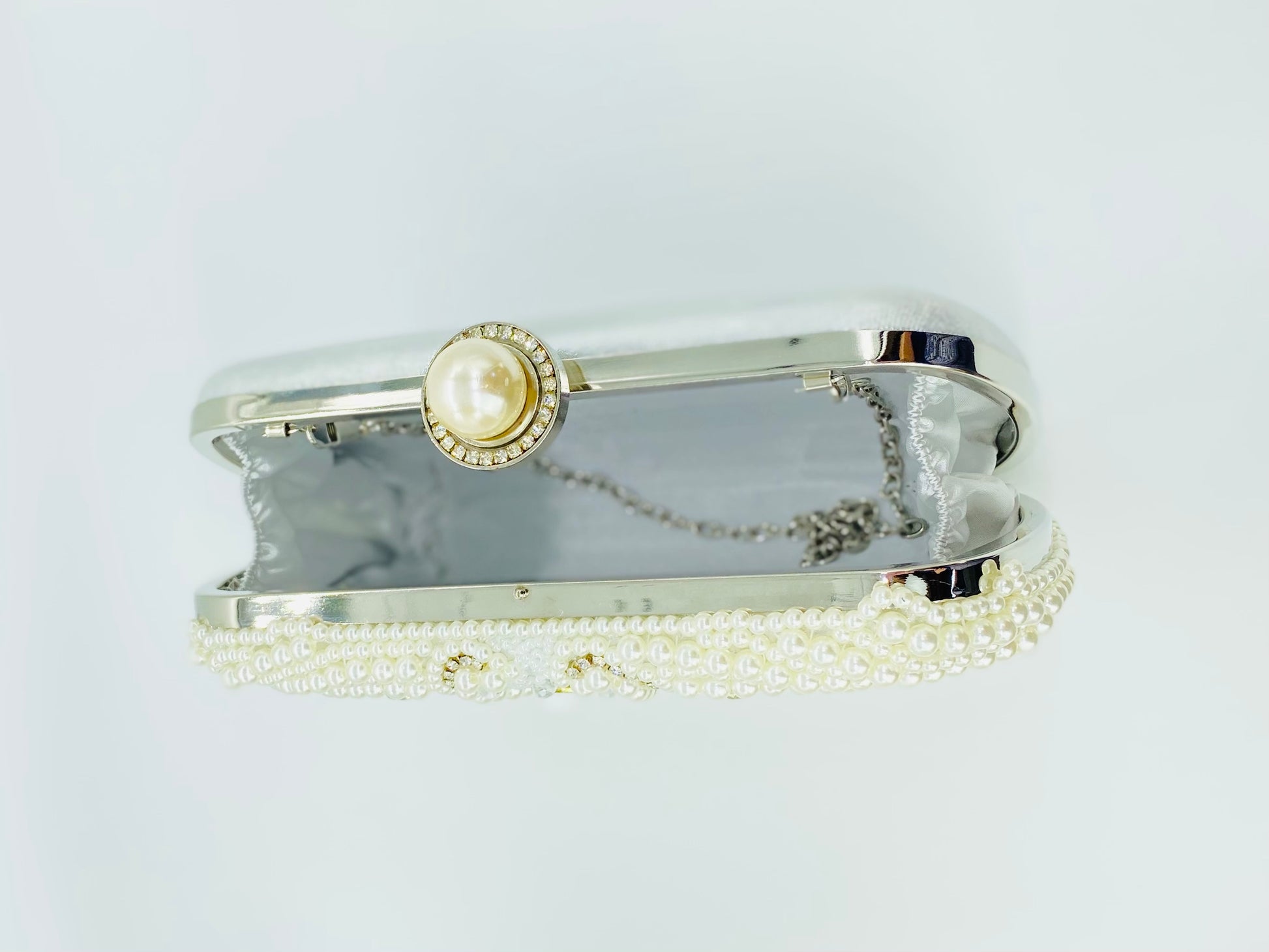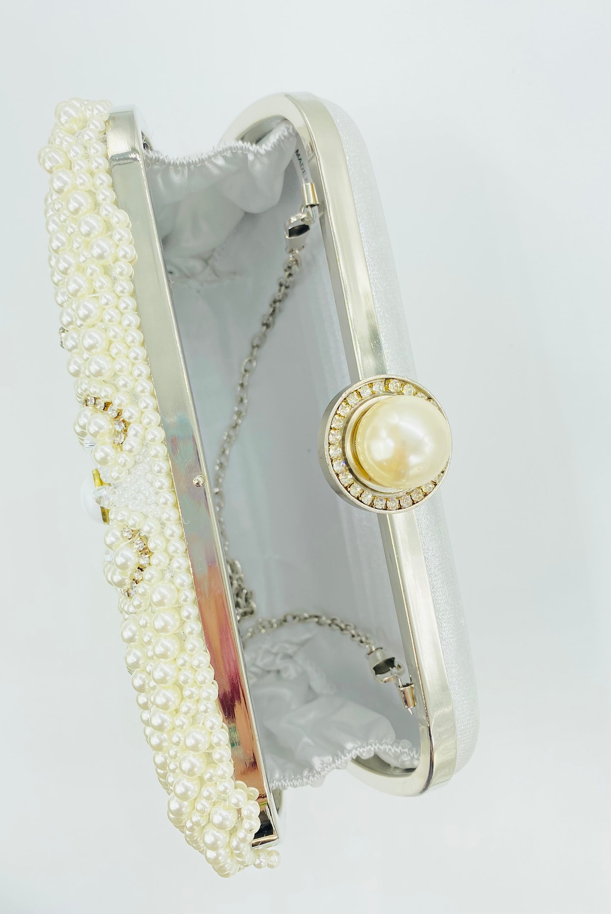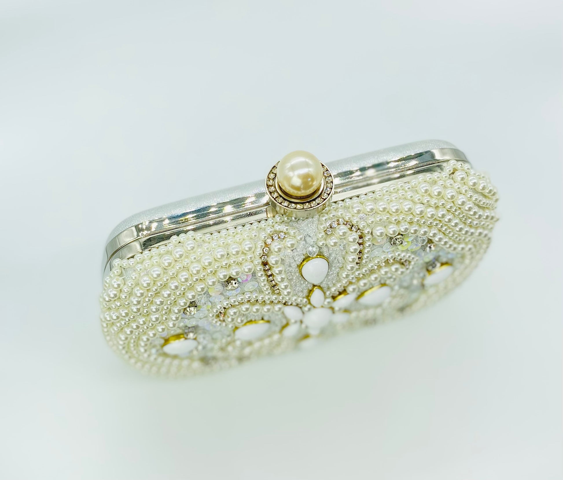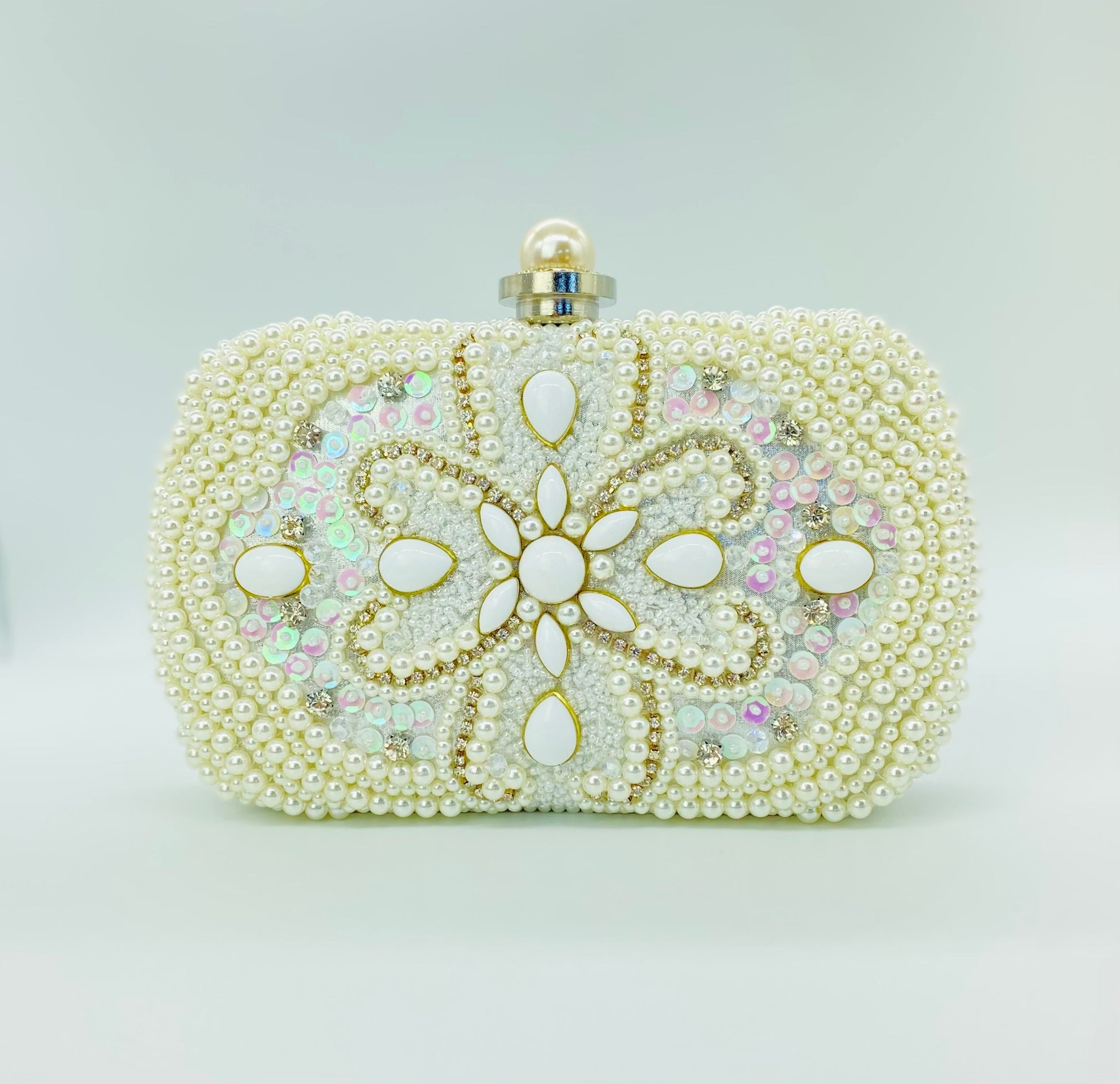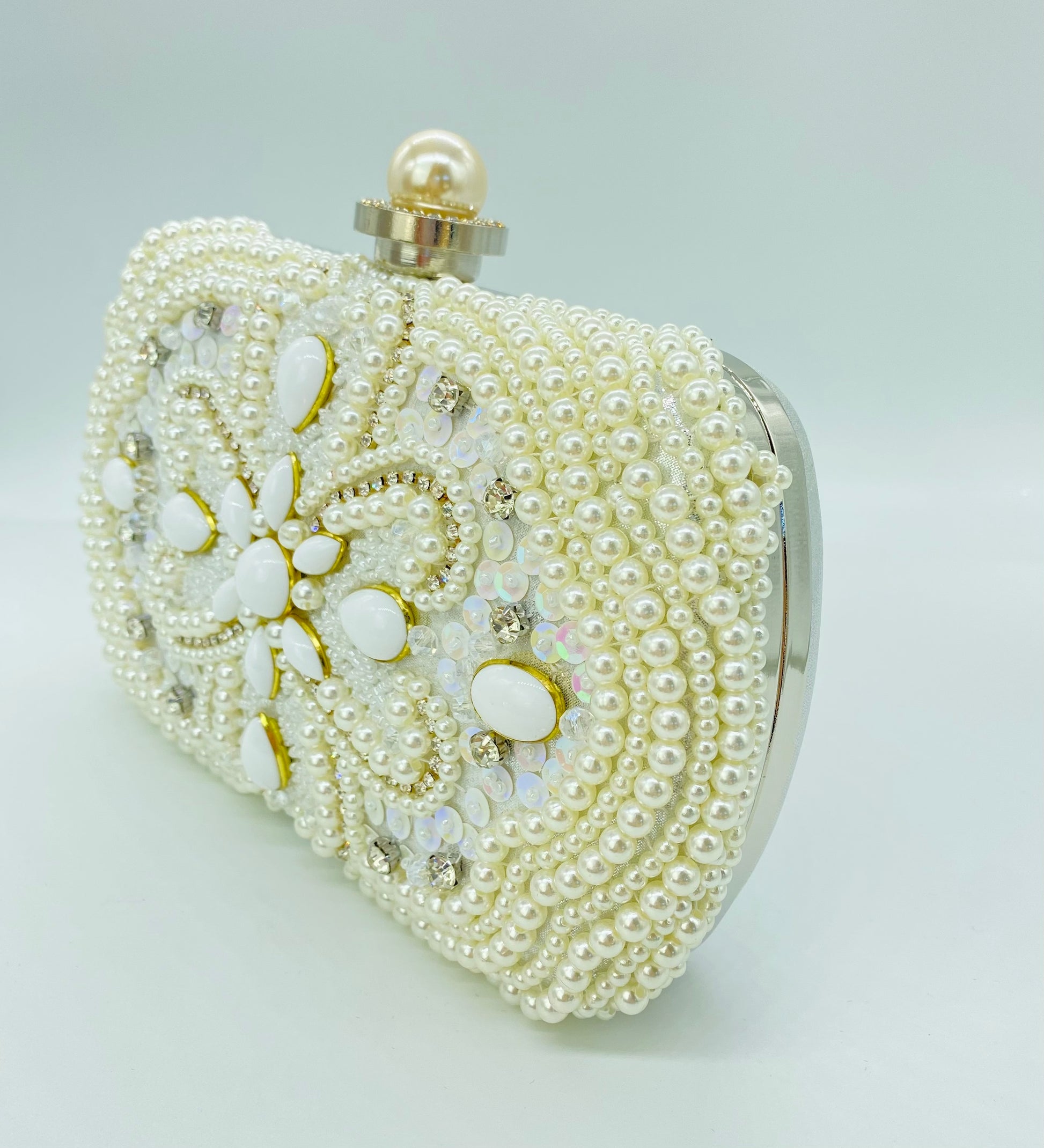 This elegant pearl-embellished clutch brings timeless sophistication to bridal and formal looks. Designed with delicate pearl beading, iridescent crystals, and soft ivory stones, the intricate pattern creates a luminous, heirloom-inspired finish that pairs beautifully with wedding gowns and evening attire. The structured silhouette and pearl clasp add a refined touch while keeping your essentials secure throughout the celebration.