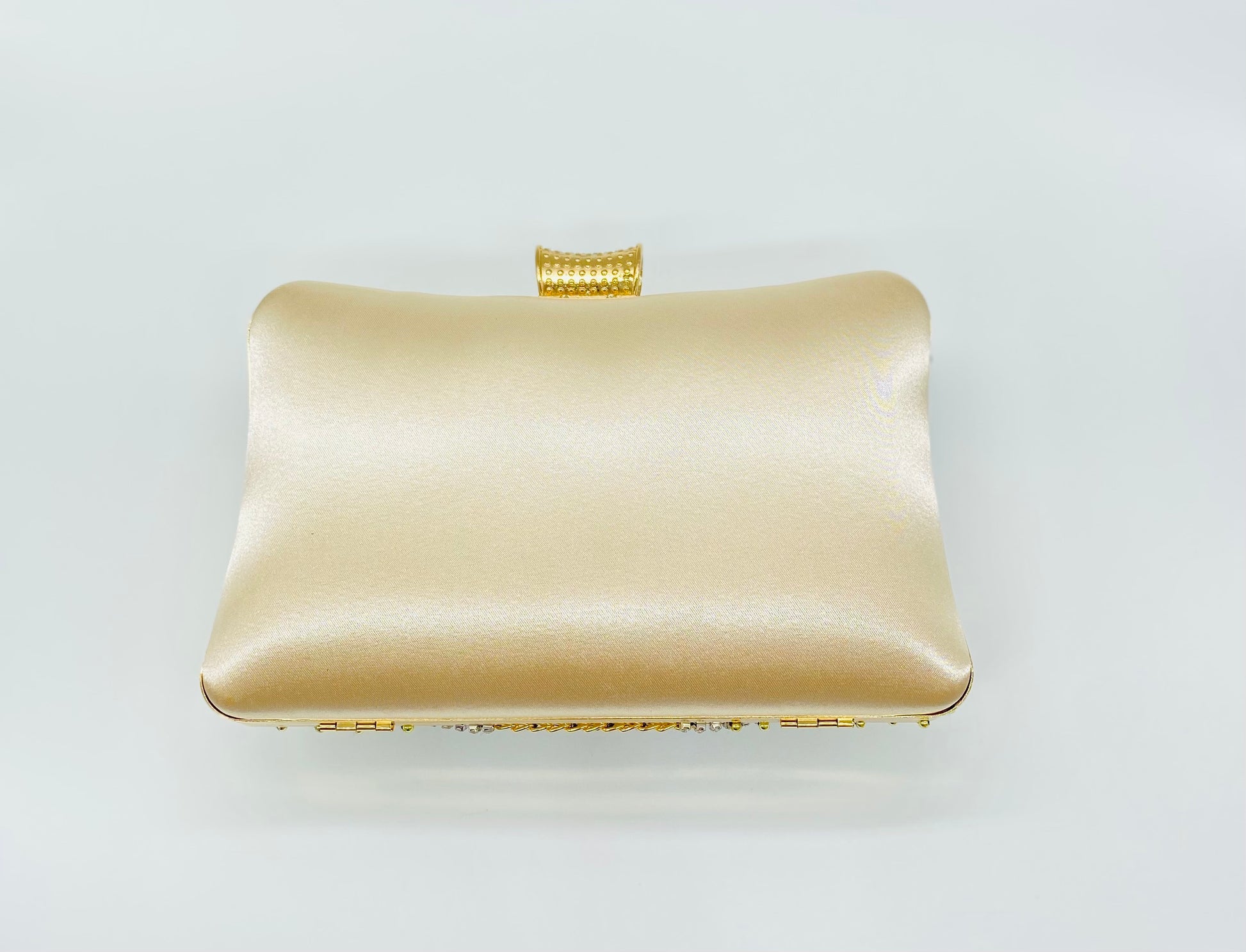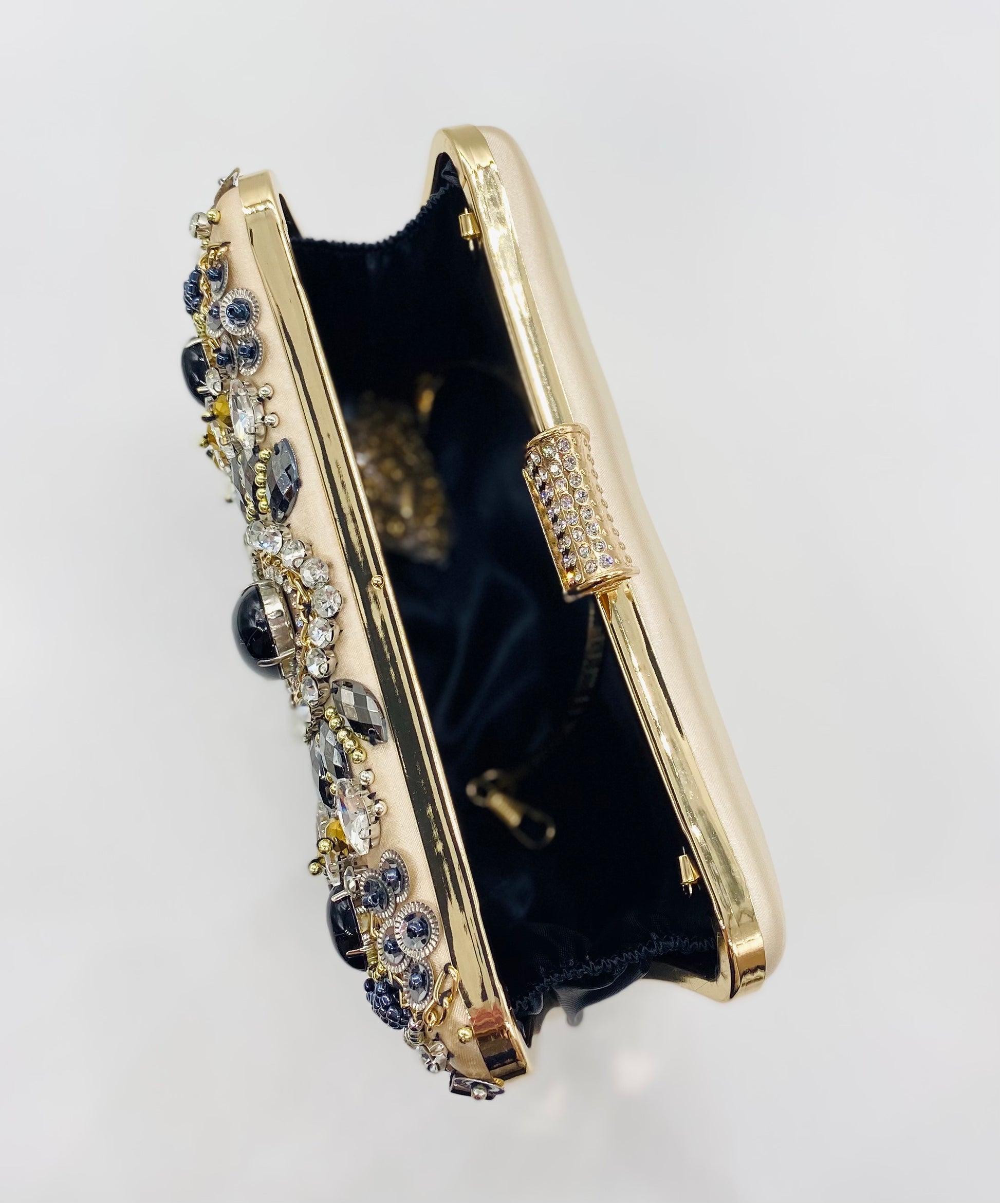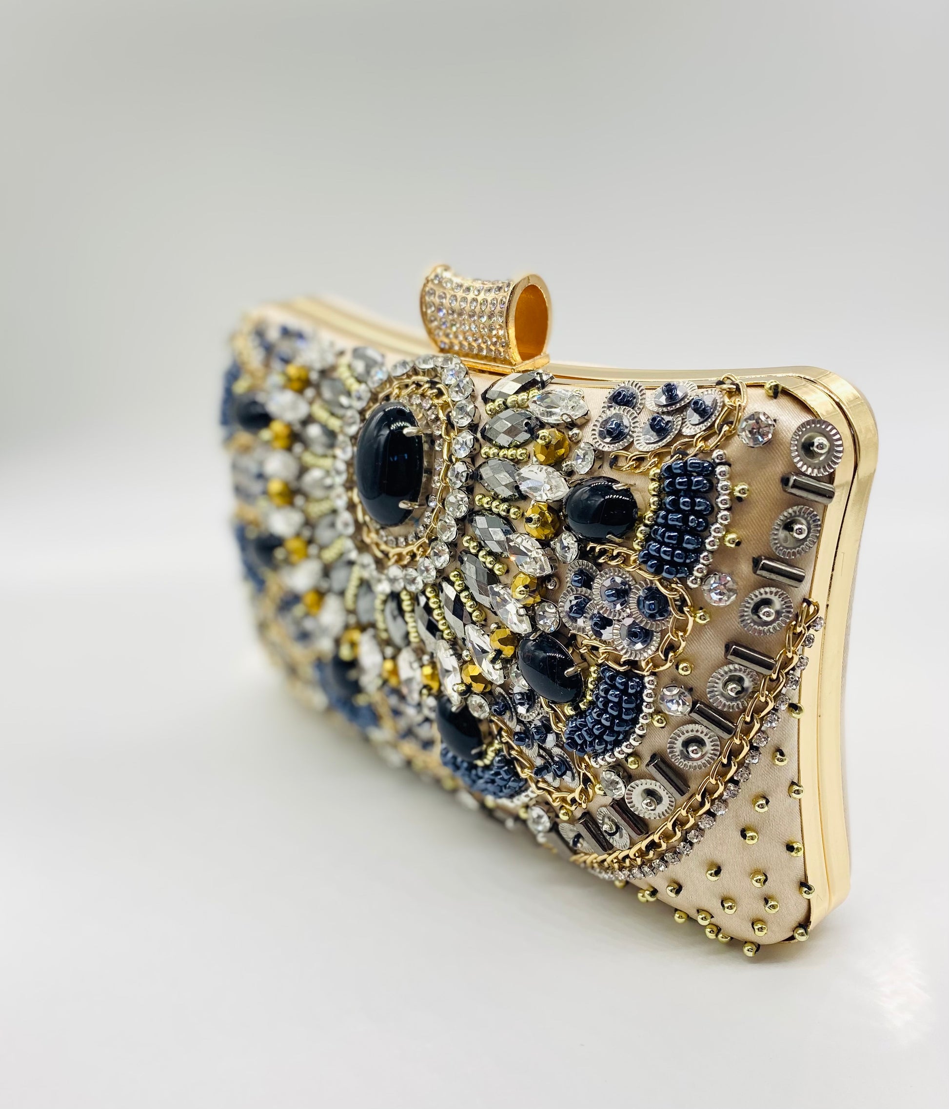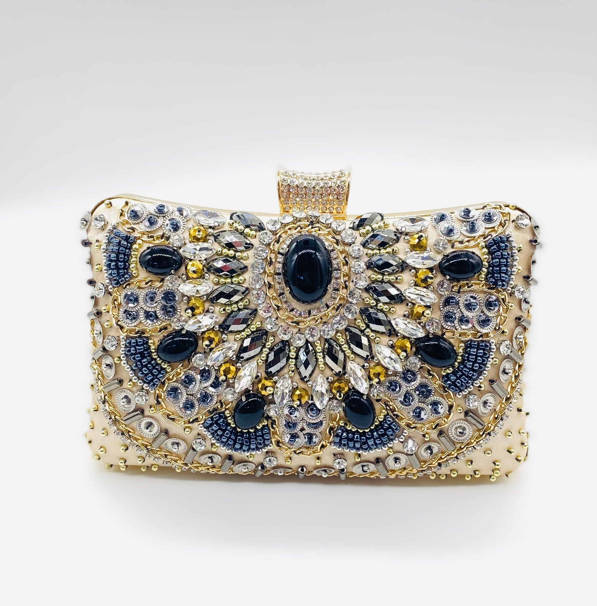 This ornate, embellished clutch adds a striking finishing touch to bridal and evening looks. Designed with intricate beadwork, crystals, and navy stones set against a champagne satin base, it creates a rich, jewel-like statement that pairs beautifully with wedding gowns, bridesmaid dresses, and formal attire. Elegant and compact, it’s perfect for carrying your evening essentials.